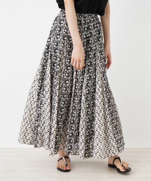 カントリー調のボタニカル柄をプリントしたロングスカート。さらりとしたタッチの薄手のコットン生地を使用し、爽やかな穿き心地を叶えました。ウエストをシェイプしつつ、裾に向かって広がりをもたせた美しいシルエットでデザインしています。ウエスト周りは総ゴム仕様で心地よくフィット。スカートを主役にした旬のコーディネートが楽しめる一枚です。