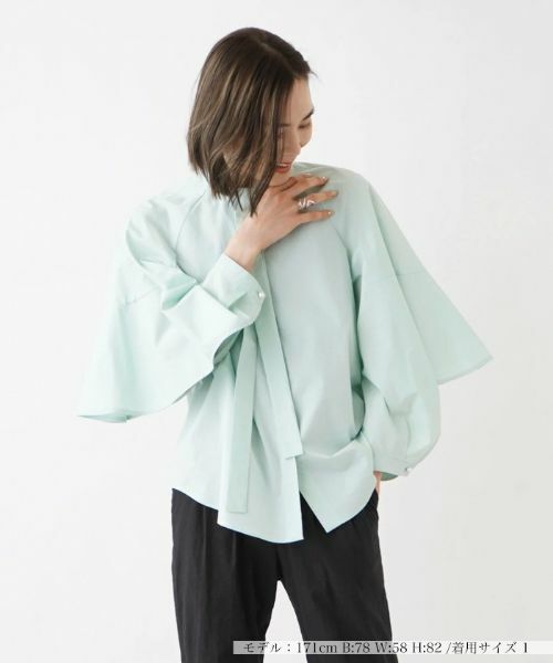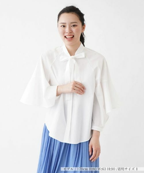 フレアに仕上げたデザイン性のあるスリーブデザインが印象的なブラウス。フロントでキュッと結んだボウタイリボンが上品さのあるワンポイントに。コットン100%のさらリとした肌触りとラグランカットのデザインで着心地も抜群。トラッドなパンツなどシンプルなアイテムに合わせるだけでノーブルなコーディネートに仕上がります。