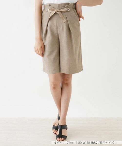 ナチュラルな雰囲気漂うさらりとした肌触りの良い素材感が大人のこなれ感のあるスタイルを後押ししてくれるショートパンツ。フロントはたっぷりと入れた立体感のあるタックと、ウエストのベルトが洗練されたデザインに。適度にゆとりを持たせたシルエットがピッタリとしすぎずレッグラインをすっきりと見せてくれます。コンパクトなサイズ感のカットソーをタックインしてすっきりとまとめたスタイルや、シアー感のあるブラウスやオーバーブラウスなどをラフに合わせた着こなしもおすすめです。