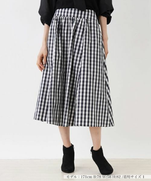 ウエストラインをすっきりと見せる切り替えデザインでメリハリをつけたギンガムチェック柄スカート。きれいなシルエットをキープするポリエステル100%の適度にハリ感のある素材を使用しています。膝が隠れるミディ丈なので、重くなり過ぎず軽やかな印象に。Tシャツやカットソー、ブラウスと幅広いトップスと好相性なので、デイリーに活躍してくれるアイテムです。秋冬は足元をブーツに変えるだけでシーズンライクな着こなしにシフトします。後ろホック&ファスナーにより開閉が可能。