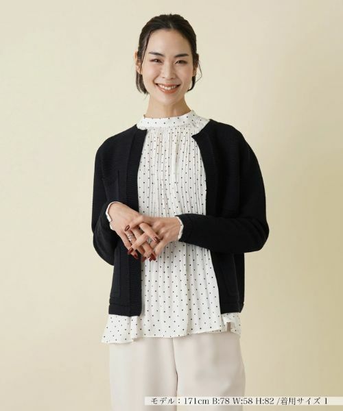 フロントに大小のポケットをあしらった、ジャケット風デザインがエレガントな表情を見せるニットカーディガン。フロントはボタンレスに仕上げた、コットンブレンドの軽やかな風合いが春コーデにピッタリのアイテムです。きちんと見えするデザインなので、シフォンブラウスなどと合わせれば女性らしい洗練されたスタイリングの完成。長すぎず短すぎない丈感なので、パンツはもちろんスカートも合わせやすくデイリーに活躍してくれそう。