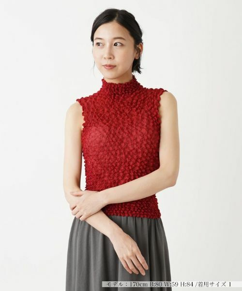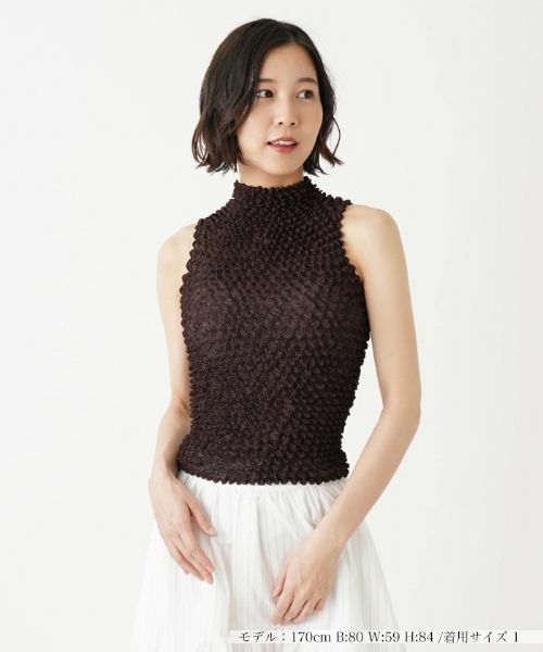 凹凸のあるふんわりとした生地の風合いが美しい表情を見せる、ジャカード織り風のノースリーブカットソー。ハイネックデザインで、ジャケットやシャツなどのインナーとしてもアクセントになります。コンパクトなサイズ感なので、ボリュームのあるロングスカートやワイドパンツとも好相性です。一点投入するだけで、コーディネートに立体感が生まれ、いつものスタイリングがニュアンスアップされます。ご家庭で手洗い可能です。