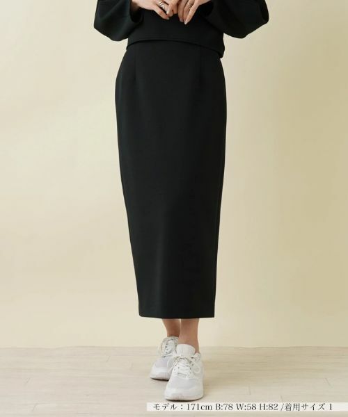 ストレッチ性のあるスムースな生地の風合いが美しいロングタイトスカート。ラインを拾いにくい、程よくゆとりを持たせたシルエットが美しいアイテム。バックウエストはゴム仕様で、心地よいフィット感を持たせました。同デザインのクロップドプルオーバーとセットアップで着こなすのもおすすめです。ウエストサイドのカギホック+ファスナーで開閉が可能。