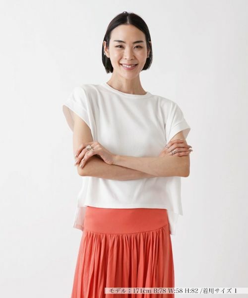 爽やかな女性らしさを引き立てる、フレンチスリーブの無地Tシャツ。バックネックはシャープなVカットで仕上げ、ヘムラインはサイドスリットを入れて前後差を作り、絶妙なバランスの抜け感を演出。柄モノのボトムスとも合わせやすく、手軽にコーディネートをアップデートできるので着こなしの幅も広がりそうです。ミニマルなデザインでありながら、ひと味違ったお洒落が楽しめる注目のトップスです。
