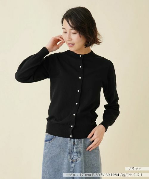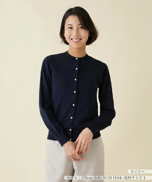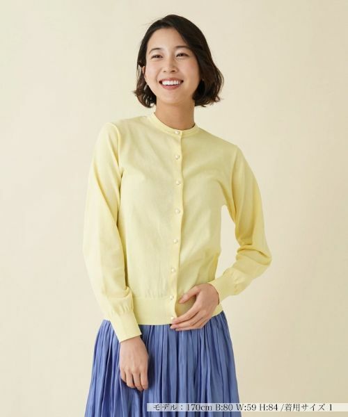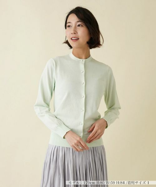 ハイゲージ編みのコットンニットでさらりと軽い着心地に仕上がった、パール調ボタン付きの長袖ニットカーディガン。ネックラインは浅めに設定し、落ち着いた上品な佇まいに仕上げました。すっきりとスタイリングできるジャストサイズなシルエットだから、きちんと感のあるクリーンな着こなしが楽しめます。飽きのこないシンプルなデザインなので、トレンドに左右されることなくタイムレスに活躍してくれます。普段使いはもちろん、オフィスシーンでも重宝しそう。