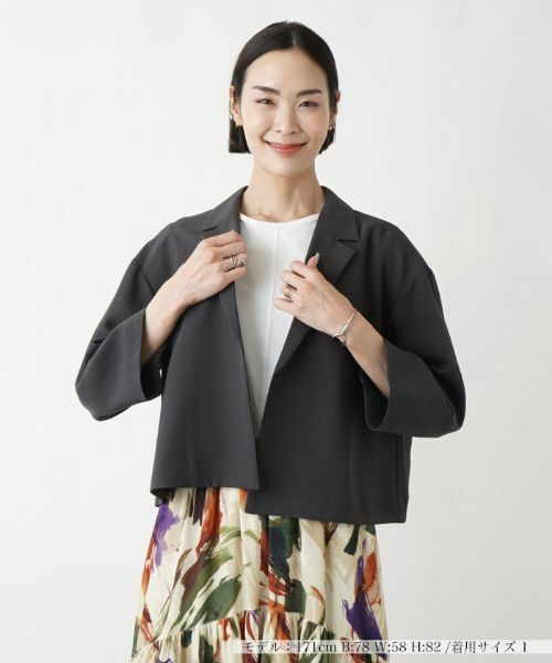 袖と着丈を少し短めに仕上げた、軽やかなルックスが印象的なテーラードジャケット。ドロップショルダーに程よくゆとりのあるシルエットが、大人のこなれ感を演出。ボタンレスのミニマルなデザインは、ちょっとした羽織りとしても活躍してくれるので、一枚持っていると重宝するアイテムです。ボリューム感のあるスカートやワンピースともバランス良く仕上がります。プリントTシャツをインに合わせれば、適度にカジュアルアップされトレンド感のあるスタイリングに。