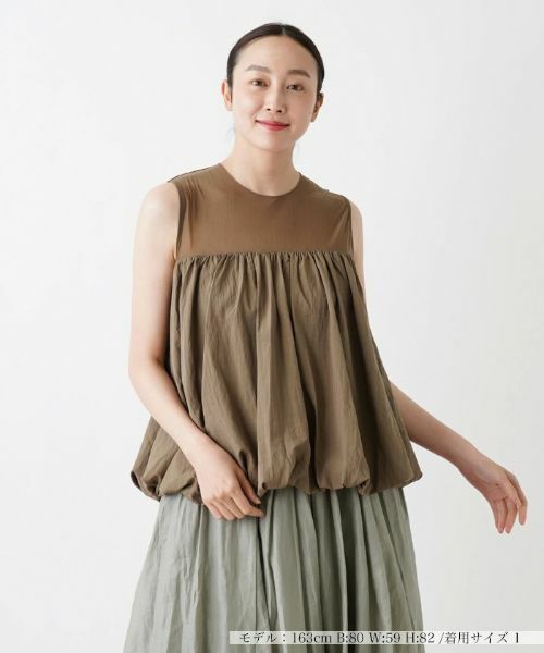 軽やかで肌触りの良い素材を使用し、ボリューム感のあるバルーンデザインがポイントのナチュラルなノーカラートップス。シンプルながらもエレガントな雰囲気を醸し出し、大人の女性らしい落ち着いた雰囲気を演出。上部はシアー感のある素材を使用し、胸上の切り替えからたっぷりとギャザーを入れ、ふんわり感をプラス。デニムパンツを合わせたカジュアルなデイリーウェアや、フレアスカートなどを合わせた華やかなスタイリングもおすすめです。