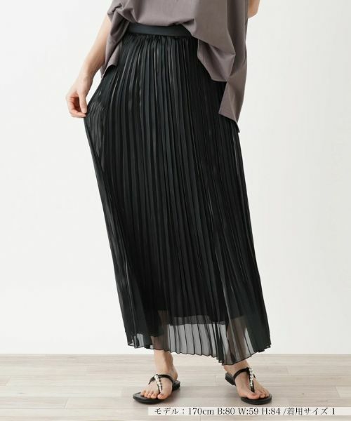 艶やかな光沢感のある素材がシックで都会的な表情のロングプリーツスカート。エレガントなプリーツデザインが施され、動くたびに美しいドレープを生み出します。ウエストは後ろのみゴム仕様になっており快適なフィット感です。モノトーンのトップスやスニーカーを合わせた、モードカジュアルやキレイめブラウスと合わせたレディライクなスタイリングもおすすめです。どんなスタイルにも合わせやすくロングシーズン活躍してくれるアイテムです。ウエストのサイドホック+ファスナーで開閉が可能。