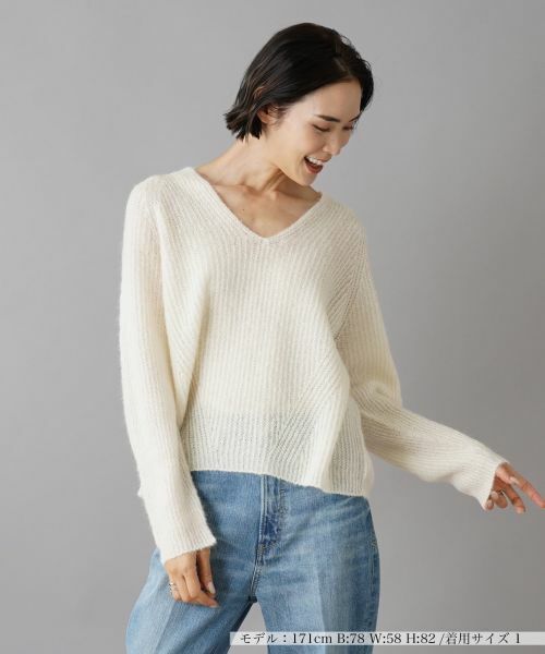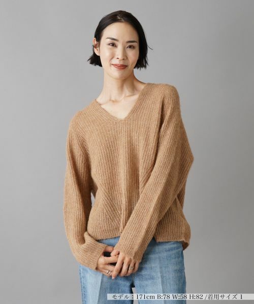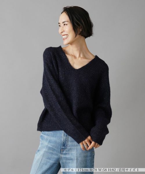 アルパカ混の柔らかな風合いと煌めくラメが華やかなVネックニットプルオーバー。ゆったりとしたシルエットが、リラックス感がありながら、こなれ感も与えます。程よい厚みのある素材感で、1枚でもレイヤードスタイルでも楽しめるアイテム。Vネックデザインがデコルテラインを美しく見せ、カジュアルなデニムスタイルからスカートとのフェミニンなコーディネートまで幅広く活躍します。シンプルながら上品にまとまるので、大人の秋冬スタイルにぴったりのニットです。