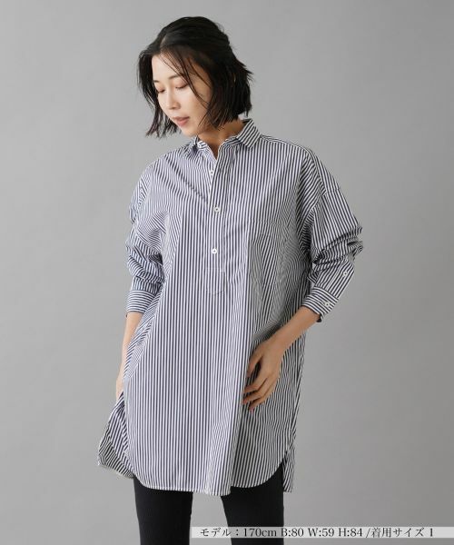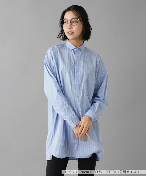 フレンチスタイルにも欠かせない、ストライプブラウス。肩のラインを落としたリラクシーなシルエットがこなれた印象に。長めの丈でパンツ合わせもさらりときまります。