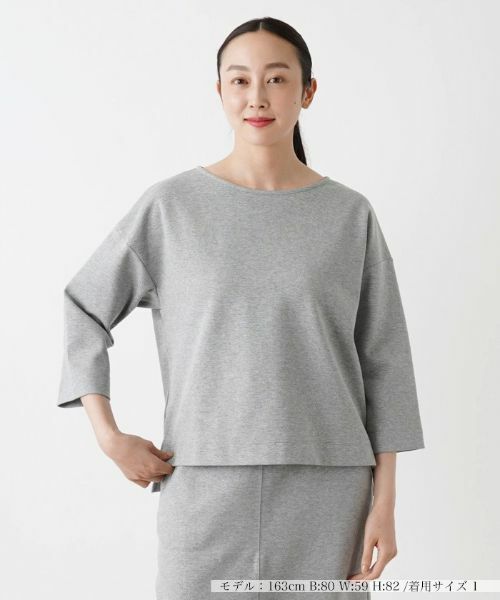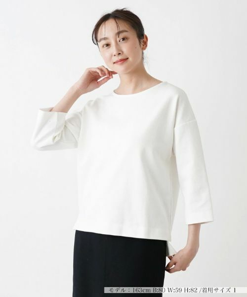 コットンベースのスムースな風合いが美しいTHREE DOTSの七分袖カットソー。ネックラインは浅めのワイドに仕上げ、上品でありながらすっきりとした雰囲気を演出。ヘムサイドスリットを配した前後差のあるシルエットがこなれ感のあるアクセントに。身幅にゆとりがあるので、1枚で着こなしてもバランス良くまとまります。飽きのこないシンプルなデザインでタイムレスに活躍してくれそう。