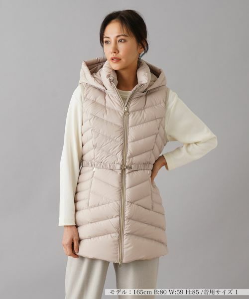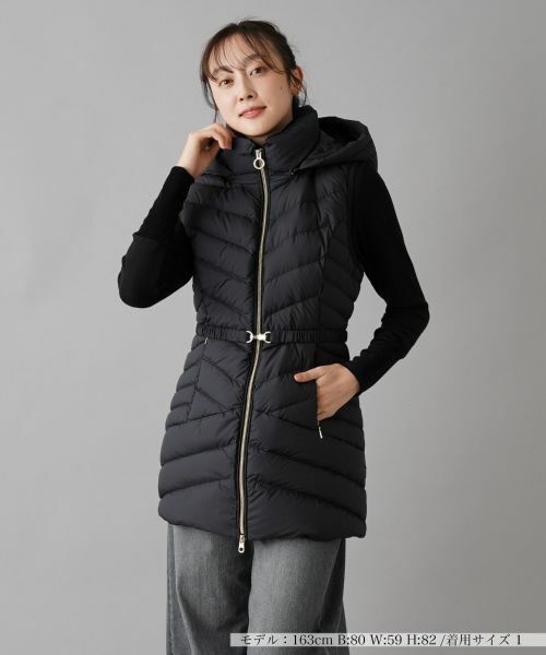 ビッグフードがインパクトを与えるダウンベスト。ボリューム感を抑えたキルティングが、すっきりとしたスマートなシルエットを実現。フロントはダブルジップ仕様で、開き具合を自在に調整できるため、好みに合わせたスタイリングが楽しめます。前ウエストの両サイドにはスリットポケットをレイアウト。ハイウエストでビット留めのベルトをマークすれば、メリハリの効いたスタイリングが完成し、シンプルなボトムスと合わせるだけでも洗練された印象に仕上がる一着です。