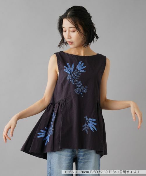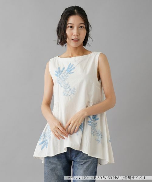 ナチュラルな風合いとさわやかな刺繍が特徴のノースリーブブラウス。前面に施された植物柄のコード刺繍が、シンプルなデザインに華やかさをプラス。ウエストサイドの高い位置にギャザーを入れ、裾にかけて広がるフレアシルエットが、フェミニンな印象を演出します。動きに合わせて揺れることで、女性らしい柔らかな雰囲気を醸し出します。バックの開きがヘルシーな肌見せ効果も。デニムとの相性も抜群で、カジュアルからちょっとしたお出かけまで幅広く活躍するアイテムです。