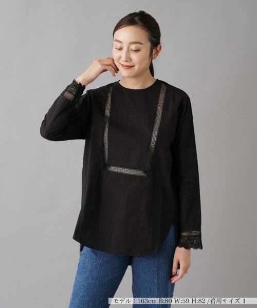 フロントのレース使いが上品で印象的なディテールデザインのブラウス。シンプルながらも存在感のあるデザインで、デイリーからちょっとしたお出かけまで幅広いシーンで活躍します。袖口にはスカラップレースをプラスし、よりフェミニンな印象をプラス。ぴったりしすぎないシルエットで体型を問わず、リラックスして着用できるのもポイントです。ラウンドヘムデザインでバックはやや長めの丈になっており、細身のパンツと合わせてもバランスがとりやすいです。背中のボタンで開閉が可能。