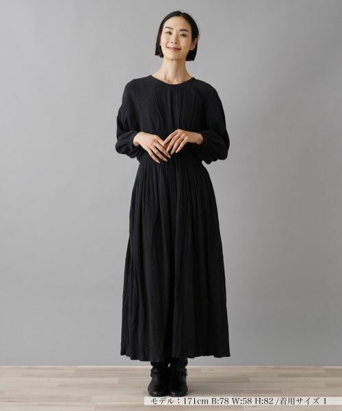 フィット&フレアなシルエットに繊細なディテールを加えた、ロングワンピース。袖口にゴムを入れたゆったりとしたスリーブと、胸元からウエストにかけて施されたシャーリングデザインが、エレガントな雰囲気を演出。生地はコットン100%の軽やかで柔らかい素材を使用しており、リラックス感と上品さを兼ね備えた一着です。後ろはVネック+リボンのデザインで女性らしいバックスタイルに。ウエストを絞ることで、スタイルアップ見せ効果も期待できます。休日のお出かけやリゾートシーンなど、さまざまなシーンで活躍すること間違いなし。バックファスナーで開閉が可能です。