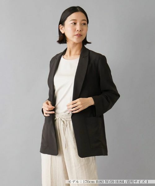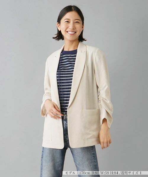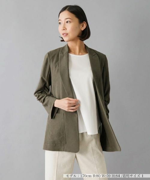 ギャザーでくしゅっとさせたスリーブで女性らしさをキープしたテーラードジャケット。薄手の軽い着心地にノーボタンのデザインで、気軽に羽織れるのも嬉しいポイント。ハンサムな着こなしと相性のいいテーラードジャケットは、パンツ合わせでスタイリッシュにまとめるのも素敵です。デニムパンツを合わせたカジュアルなスタイリングから、スカートを合わせたフェミニンなスタイリングもおすすめです。------------------------------------着用シーズン:初秋伸縮性:ややあり透け感:色によりありポケット:あり生地の厚さ:薄手裏地:なし-------------------------------------※商品の色味は、撮影場所や光のあたり具合、お客様のお使いの機器により色味が違って見える場合がございます。予めご了承ください。家庭洗濯不可漂白不可タンブル乾燥不可アイロン低温120℃までドライクリーニング可ウェットクリーニング不可