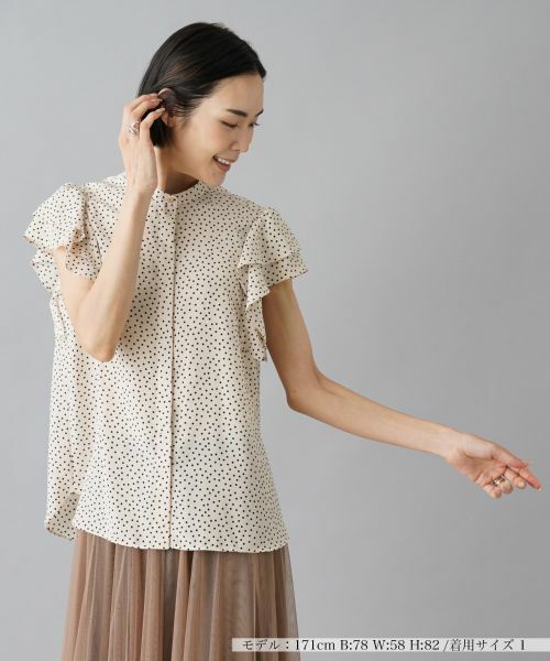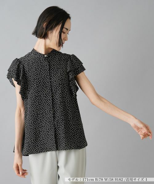 細やかなドット柄をちりばめた、比翼仕立てのバンドカラーブラウス。ボリュームたっぷりのティアードラッフルスリーブがインパクトを放ち、大人フェミニンな華やかさを演出。バックにはギャザーを施しており、動きに合わせて柔らかなニュアンスを作り出します。シンプルなボトムスを合わせるだけで個性が引き立ち、コーディネートの幅を広げてくれそうです。オフィスカジュアルから休日のリラックススタイルまで、様々な着こなしで活躍すること間違いなしのトップスです。