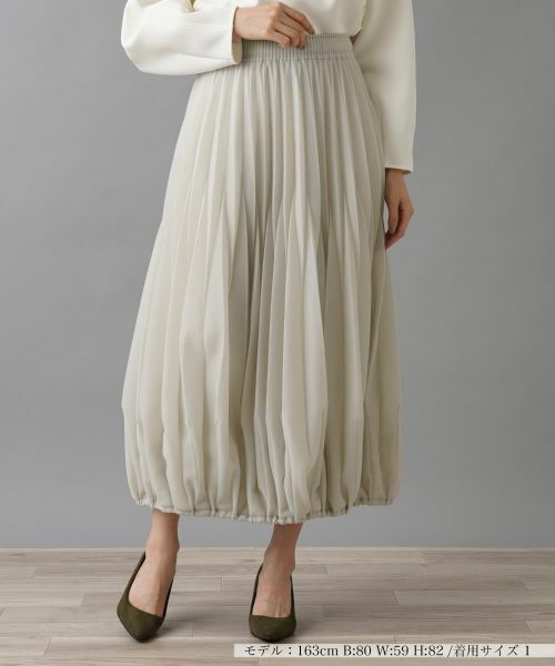 フェミニンで洗練されたデザインが魅力のロングスカート。細かく入ったプリーツが、美しいドレープを生み出し、動くたびに上品なシルエットを演出します。ウエストは総ゴム仕様で、フィット感がありながらも快適な着心地に。裾にはゴムを入れ、緩やかに広がるバルーンシルエットに仕上げました。シアー感のある軽やかな素材を使用しており、女性らしい柔らかな表情が特徴の一枚です。シンプルなトップスやブラウスと合わせて、オフィスカジュアルからデイリーコーディネートまで、幅広く対応できます。