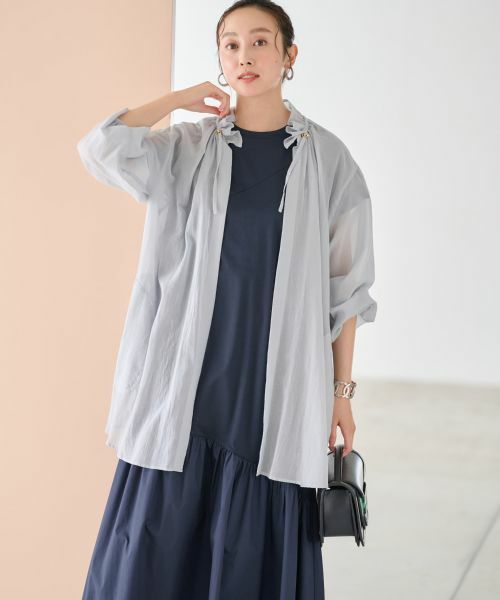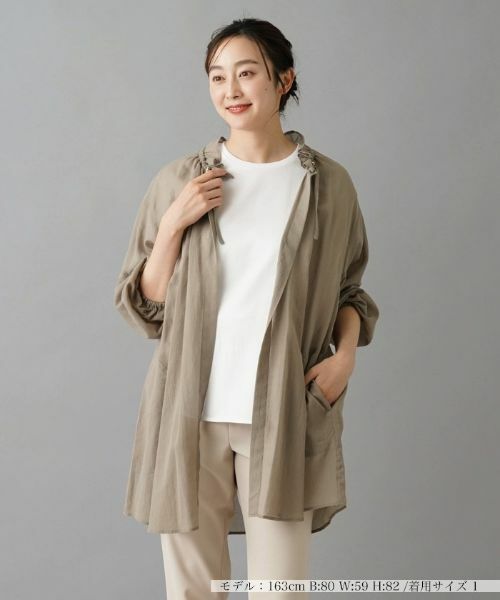 ネックやバックのシャーリング使いが特徴的なロングジャケット。シアー感のある薄手のコットン生地を使い、リラクシーなシルエットでデザインしています。袖はゆったりとしたボリュームスリーブ、フロントはノーボタン仕様で軽やかなニュアンスに。ヒップまで隠れる程度の丈感で体型カバーもバッチリ。カジュアルな中にも大人の女性らしいエレガンスが薫る、旬のスタイリングが完成するアウターです。ネックはドローコードにより調整が可能。