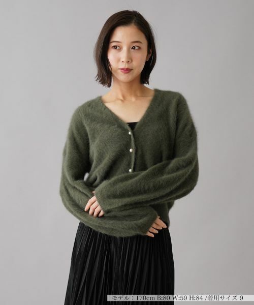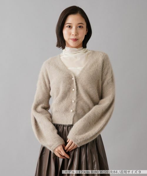 ふんわりとした質感が肌に優しく、着心地の良さが魅力のVネックニットカーディガン。程よいボリュームのある袖と、女性らしいシルエットを演出するVネックデザインがポイント。フロントのボタンにはさりげないパール調ボタンのアクセントがあしらわれ、華やかさをプラス。シンプルなデザインながらも、エレガントなスタイルやカジュアルな装いにも合わせやすく、秋冬シーズンに活躍するアイテムです。