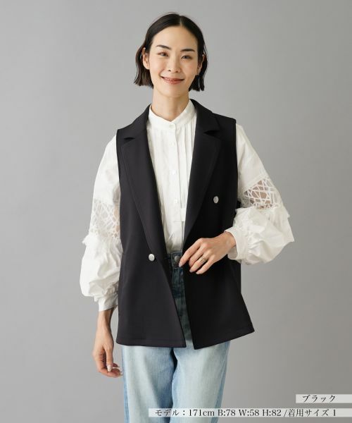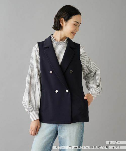 知的な魅力を放つダブルブレステッド仕様のテーラードベスト。ブラウスやニットに合わせるだけで、ワンランク上の上級者らしいコーディネートに仕上がります。手洗い可酸素系漂白可タンブル乾燥不可つり干し(日陰)アイロン低温120℃まで石油系溶剤ドライクリーニング弱ウェットクリーニング(弱い処理)