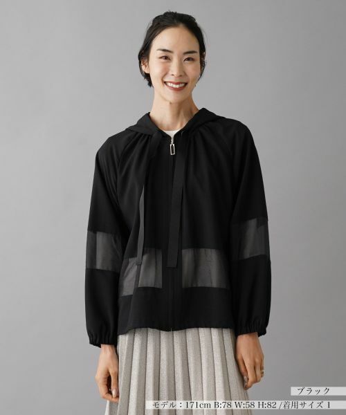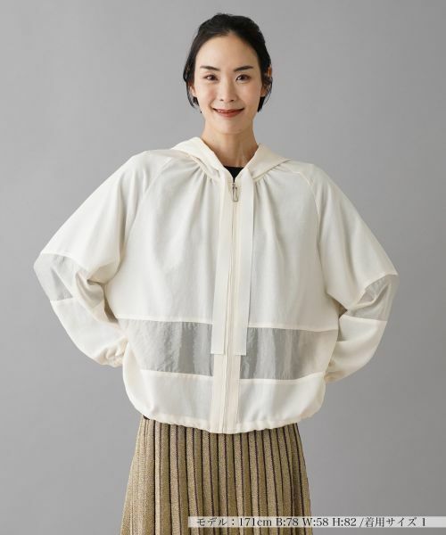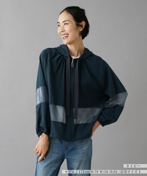 袖やボディに施されたシアーな切り替えがアクセントとなり、シンプルながらもおしゃれな印象を与えてくれるフーディジャケット。軽やかな素材感とリラックスしたシルエットが魅力のアイテムです。肩を落としたラグランスリーブが動きやすく機能性も抜群。
