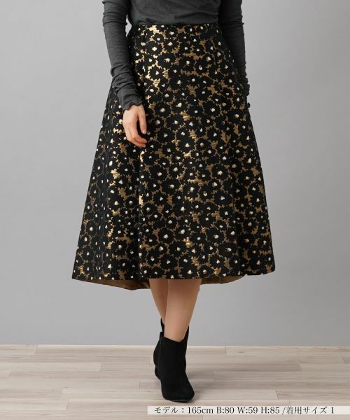 1枚で存在感を放ち、デザインにこだわりが光る華やかなフレアスカート。フロントにはタックを入れ、ウエスト部分はすっきりと見せつつ、裾にかけて広がるシルエットで優雅な動きを演出。ほんのりとしたテールバックスタイルも魅力的なポイントです。群馬県桐生で製作されたオリジナル素材は、精密な「ドルニエ織機」を用いて織り上げられた特別な一枚です。ゴールドとブラックで構成されたフラワーモチーフが特徴的で、ラメの扁平糸とマットなコットン糸を組み合わせたことで、独特な陰影を表現しています。シンプルなニットやブラウスを合わせるだけで、華やかな装いにアップデートしてくれるアイテムです。サイドホック+ファスナーで開閉が可能です。