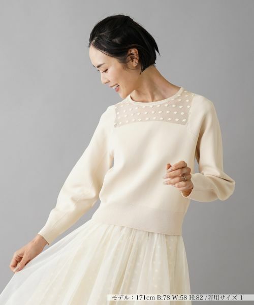 透け感のあるドット柄のチュール切り替えが特徴的で、フェミニンさとモダンさを兼ね備えたニットトップス。シンプルなデザインながらも、ディテールにこだわった仕上がりで、上品な印象を与えます。背中部分のファスナーデザインがさりげないアクセントに。袖に少しボリューム感があり、シルエットにメリハリをつけ、女性らしさを引き立てます。スカートやパンツスタイルにも合わせやすく、カジュアルにもきれいめなスタイルにもぴったりです。