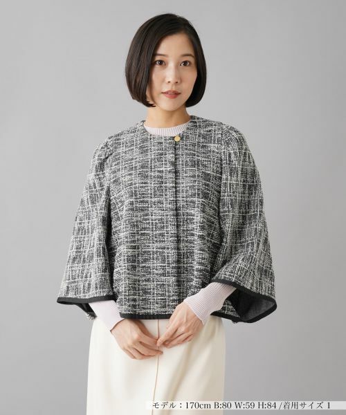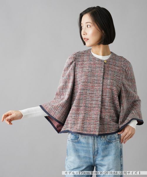 着やすさと上品さを兼ね備えたデザインが特徴のツイードジャケット。華やかな表情のツイード素材を使用しており、どんなシーンでも活躍します。袖口や裾に施されたコントラストの効いたパイピングが全体を引き締め、洗練された印象を与えます。肩から流れるような立体感のあるシルエットが女性らしい柔らかさを演出し、軽やかに着こなせるのも魅力のひとつです。デニムと合わせてカジュアルダウンしたコーディネートはもちろん、きれいめなパンツやスカートと組み合わせても素敵に仕上がります。フロントの比翼ボタンで開閉が可能です。