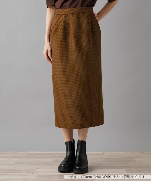 秋冬シーズンらしい深みのあるカラーと、クラシカルで洗練された印象を与える千鳥格子柄が魅力のタイトスカート。細かな千鳥格子柄が上品な雰囲気を演出し、カジュアルにもオフィススタイルにも合わせやすいデザインとなっています。ウエスト部分は後ろのみゴム仕様になっており、すっきりとした仕立てで、シルエットを美しく見せてくれます。サイドポケットには、さりげなく施された無地のトリミングがアクセントになっており、シンプルながらも個性的なディテールがポイントに。トップスにはシンプルなブラウスやニットを合わせると、エレガントでスタイリッシュなコーディネートが完成します。同素材のジャケットを合わせたセットアップでの着こなしや、ブーツと合わせたスタイリングもおすすめです。サイドホック+ファスナーで開閉が可能です。