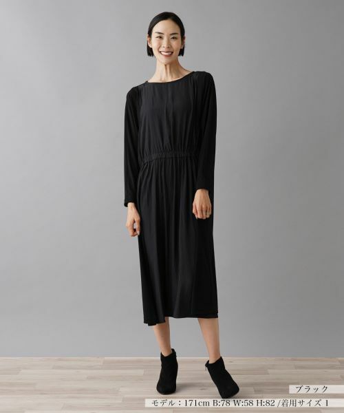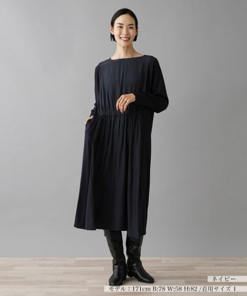 フロントのウエスト部分にゴム入りのギャザーを施したリラクシーに着用できるワンピース。前ウエスト部分のギャザーがシルエットを美しく引き締め、足長見せ効果も。落ち着いたカラーとシンプルなデザインが、洗練された印象を与えます。膝の隠れるミディ丈で、ロングブーツとの相性も抜群。合わせる小物やアクセサリーで、カジュアルにもエレガントにも着こなせるアイテムです。素材の柔らかさが動きやすさを保ちつつ、上品な雰囲気を醸し出します。