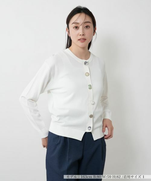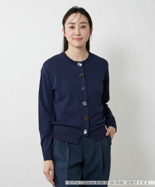 華やかなビジューボタンがアクセントになったクルーネックカーディガン。シンプルなデザインながら、異なる形のボタンがさりげなく個性をプラスします。程よくコンパクトなシルエットで、ボトムスを選ばず着こなしやすいのが魅力。しっとりとした肌触りの良いニット素材を使用し、着心地も抜群です。デニムでカジュアルダウンしたり、スカートと合わせてフェミニンに仕上げたりと、幅広いスタイルに対応。1枚でコーデの主役になる、エレガントなカーディガンです。フロントはスナップボタンで開閉が可能です。