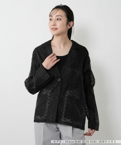 大人のこなれ感を演出するシアードットテーラードジャケット。透け感のある素材にクラシックなドット柄を施し、エレガントさとカジュアルさを兼ね備えたデザインに仕上げました。軽やかな着心地で、春夏の羽織りとして最適。テーラードシルエットが洗練された印象を与えつつ、ポケット付きで実用性もあるデザインに。シンプルなインナーと合わせるだけでこなれたスタイルが完成します。デニムやスカートとの相性も抜群な、トレンド感溢れる一枚です。
