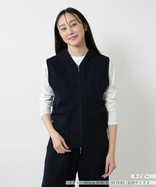 フード付きのデザインが特徴のニットベスト。フロントはダブルジップ仕様で着脱しやすく、カジュアルながらも洗練された印象に仕上がります。程よくゆとりのあるシルエットで、シャツやカットソーとレイヤードしやすく、季節の変わり目にも活躍するアイテム。フロントには便利なポケット付きで、実用性のあるデザインに。デイリーコーディネートに取り入れやすく、こなれ感のあるスタイルを演出できる一着です。
