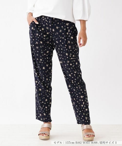 大小のスタープリントが美しいデザインのテーパードパンツ。薄手のさらりとした生地を使用した、落ち感のあるシルエットが上品さのあるアイテム。ゆったりシルエットのニットやTシャツなどとラフに着こなすだけでも素敵なコーデに。