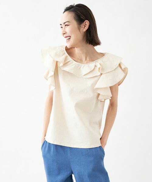 ネックラインからスリーブにかけて大きなフリルをたっぷりと取り入れたブラウス。清楚な愛らしさあふれるルックスで、デイリースタイルをオシャレに彩ります。二の腕の華奢見えにも貢献してくれるのもうれしい。