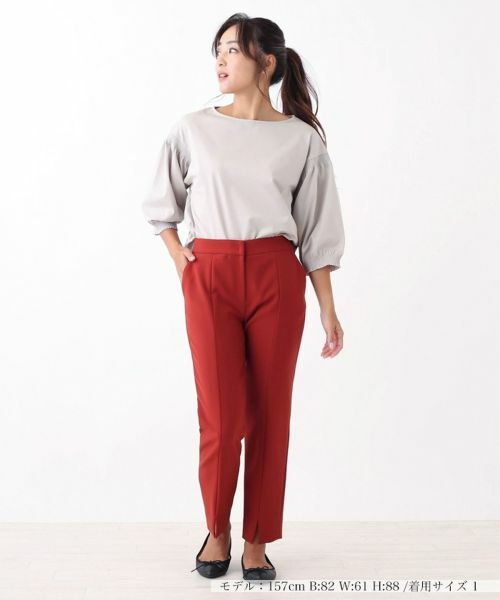 シンプルな白シャツなどとのコーディネートにぴったりのカラーパンツは、スマートなシルエットで美脚見せにも期待大。ポリウレタン混の素材なので、動きやすく穿き心地も抜群。フロントヘムにはスリットが施されているから、さりげなく軽やかな抜け感もキャッチした着こなしが楽しめます。シンプルなデザインで、トップスを選ばず手持ちのお洋服とも合わせやすいので、ワードローブ1枚あると便利なアイテムです。