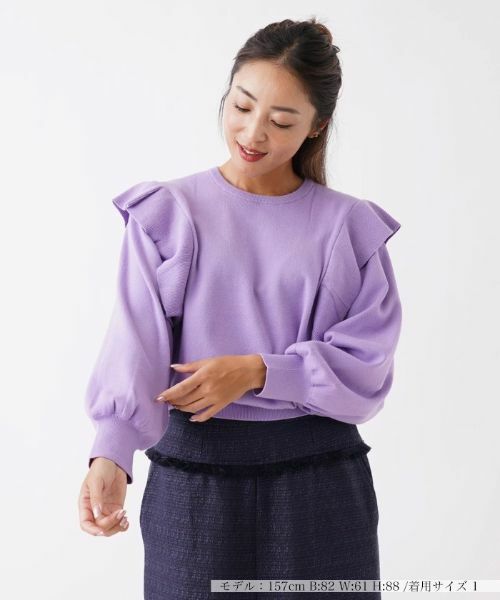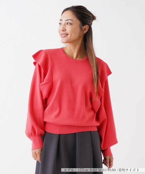 袖の切替え部分を飾るフリル使いがフェミニンなニットプルオーバー。スリーブにも程よくボリュームを持たせた可愛さのあるデザイン。首元はシンプルなクルーネックで、顔まわりはすっきりとした印象に。少し短めの着丈なので、ボトムスは適度にボリュームのあるワイドパンツやフレアスカートなど合わせると、バランス良くコーディネートできます。