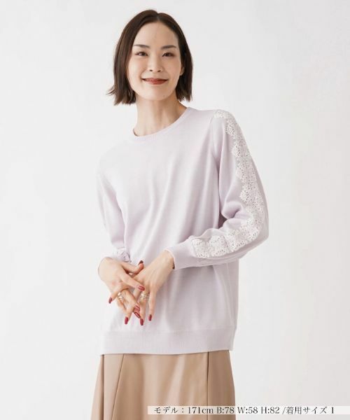 軽やかな印象でスタイリングできる薄手のニットプルオーバー。袖にあしらった優美なコットンレースがアクセントになり、可憐な華やぎをキャッチ。シンプルなクルーネックと、程よくゆとりをもたせたリラックスシルエットでバランスよくデザインしています。これからの季節のスタイリングを繊細かつレディに彩ってくれる注目度の高いトップスです。