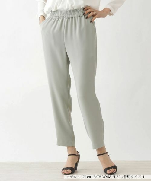 腰周りに程よくゆとりを持たせ、裾に向かってスッキリとシェイプしたテーパードシルエットのアンクルパンツ。ウエスト周りにはギャザーを施し、柔らかなニュアンスに。ストレッチ性のある生地を使用し、ウエストにはゴムを通しているから快適な穿き心地をキープできます。シンプルな無地でトップスともコーディネートしやすい一本。