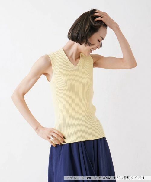 ミニマルなデザインのリブ編みニットタンクトップ。すっきりと身体にフィットするコンパクトなシルエットだから、タックインももたつき感なく仕上がります。開きすぎないシャープなVネックが上品な印象を与え、清楚な女性らしさを演出。ボトムスともコーディネートしやすく、オンにもオフにも活躍する着回し力の高いトップスです。