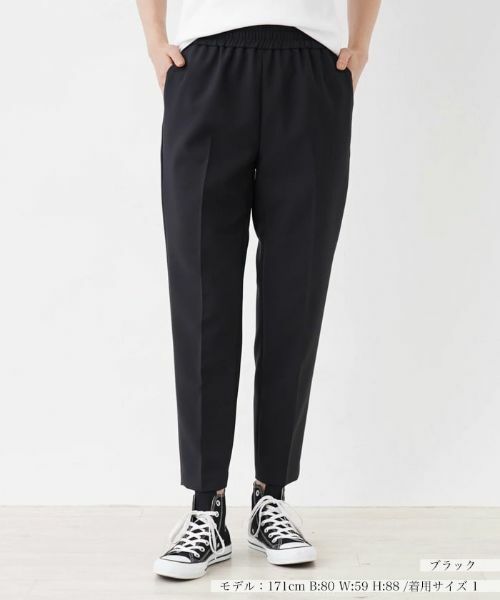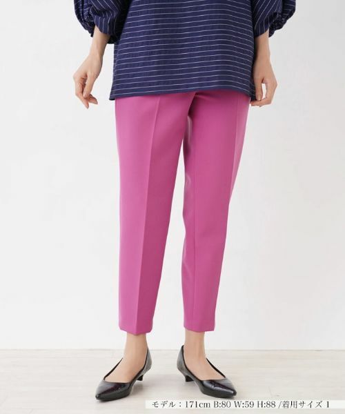 すっきりとしたテーパードシルエットがスタイルアップをアシストしてくれるパンツ。ギャザーウエストのイージー仕様やストレッチ素材で穿き心地も抜群。センタープレスが入っているので、きれいめなスタイルはもちろん、普段使いにも活躍してくれるアイテムです。オーバーサイズのシャツやニットと合わせた大人カジュアルスタイルも素敵。豊富なカラーラインナップを揃えているので複数買いしておくのもおすすめです。