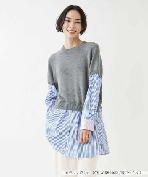 ロング丈のストライプシャツと編み柄を取り入れた半袖ニットプルオーバーをレイヤードしたようなドッキングニットプルオーバー。1枚でレイヤード風の着こなしが完成するので、簡単にお洒落なスタイリングが完成します。袖口のカフス部分のカラーをさりげなく変え、アクセントをプラス。ヒップラインが隠れる丈感なので、パンツスタイルとも相性抜群。お手持ちのボトムスと合わせるだけで、トレンドライクな着こなしにアップデートしてくれるアイテムです。