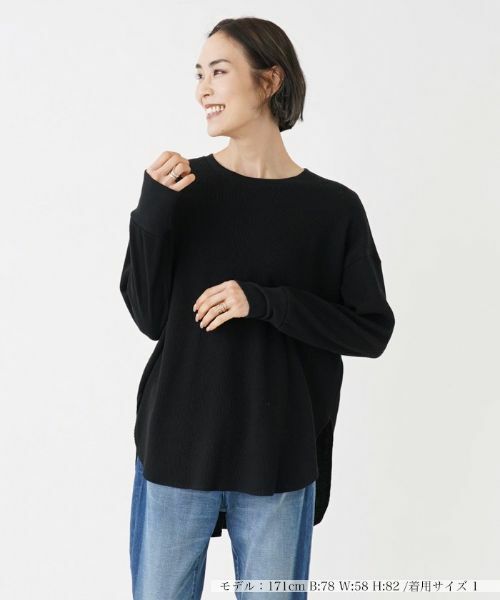 ふんわりと優しい肌触りのコットン100%のワッフル素材で着心地抜群の長袖カットソー。サイドを大胆にカットしたカーヴィーなヘムラインでこだわりのアレンジをプラス。ヒップラインが隠れる丈感なので、パンツスタイルもすっきりとした印象に。デニムパンツやカーゴパンツと合わせたカジュアルでラフなスタイリングもおすすめ。一枚でさらっと着るのはもちろん、ジレやボアベストなどトレンドアイテムとも相性抜群です。背中のボタンで開閉が可能。