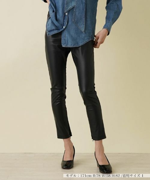 程よい光沢感のあるフェイクレザーと伸縮性抜群のストレッチ素材を前後で切り替えたレギンスパンツ。伸縮性のある素材でアクティブに動きやすく、ウエストは総ゴム仕様で穿き心地も快適。裾の内側にはファスナーをあしらっているから、開き具合を調節することで足元のさりげないアレンジが楽しめます。オーバーサイズのブラウスやワンピースなどに合わせるとスッキリとしたコーディネートに。
