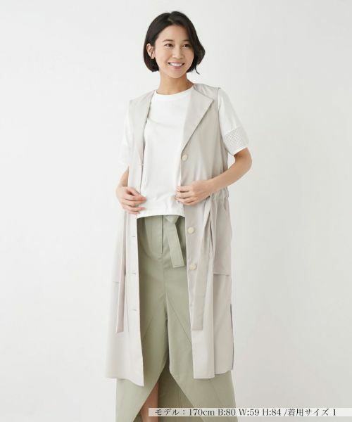 密度の高い上品な風合いの生地を使用した、ロングジレ。ウエストのドローストリングをフロントで結ぶことで、さりげなく大人の可愛らしさを演出します。サイドにレイアウトされた大きなパッチポケットや、動きやすさを考慮したサイドスリットといったディテールがこだわりを感じさせます。ミニマルなデザインでインナーやボトムスとも合わせやすく、これからの季節のコーディネートを格上げしてくれる上級者らしいアイテムです。