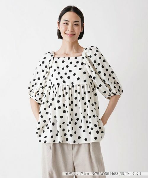 手描きタッチのドットをランダムに散りばめたプルオーバーブラウス。ボリューミーなバルーンスリーブとバスト下の切り替えで、大人キュートなムード満載のトップスです。端正なスクエアネックがデコルテを綺麗に覗かせ、絶妙なバランスの抜け感を演出。シンプルなパンツを合わせるだけでも抜かりなくレディに決まります。バックファスナーにより着脱が可能。ジップの引き手にあしらったロングリボンがさりげなく存在感を放つアクセントに。