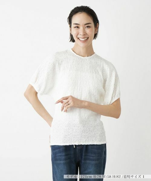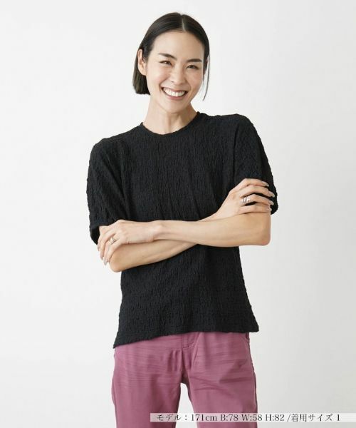 独特の凹凸があり、柔らかく風合い豊かな生地を使用したカットソー。ふっくらとしたボリュームスリーブが大人可愛いシルエットを描き出し、スタイルを華やかに引き立てます。袖口はゴム仕様で心地よくフィットし、素肌に優しく寄り添う快適な着心地を提供します。カジュアルからキレイめな着こなしまでお好みでアレンジでき、多彩なコーディネートにマッチする万能アイテムです。バックネックの涙あきはボタン開閉が可能。