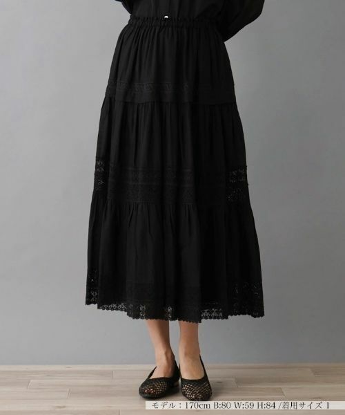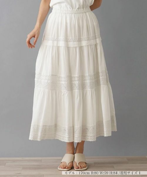 レースの切り替えでデザイン性を高めた、やさしい表情が魅力的なロングスカートです。歩くたびにふわっと揺らめく軽やかなコットンブレンド素材がナチュラルムードを後押し。ウエストは総ゴム仕様で、フィット感もあり穿き心地も快適。甘さのあるデザインなので、Tシャツやデニムシャツなどと合わせたカジュアルなスタイリングや、同カラーのブラウスを合わせたワントーンコーデもおすすめです。