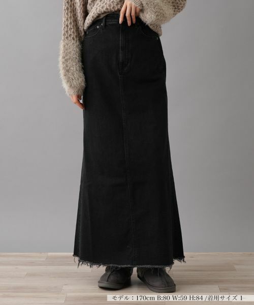 ロング丈で落ち着いた雰囲気のブラックデニムスカート。裾部分にはさりげないカットオフデザインが施され、カジュアルなニュアンスもプラス。スタイルアップ見せを叶えるハイウエストシルエットが特徴で、トップスをインしてもアウトにしてもバランスよく着こなせます。やや厚みのあるデニム素材なので、秋冬のコーディネートにもぴったり。ざっくりとしたニットやボリューム感のあるトップスとの相性が良く、季節感を感じるおしゃれを楽しむことができます。------------------------------------着用シーズン:秋伸縮性:あり透け感:なしポケット:あり生地の厚さ:やや厚手裏地:なしウエスト:伸縮性あり-------------------------------------※商品の色味は、撮影場所や光のあたり具合、お客様のお使いの機器により色味が違って見える場合がございます。予めご了承ください。